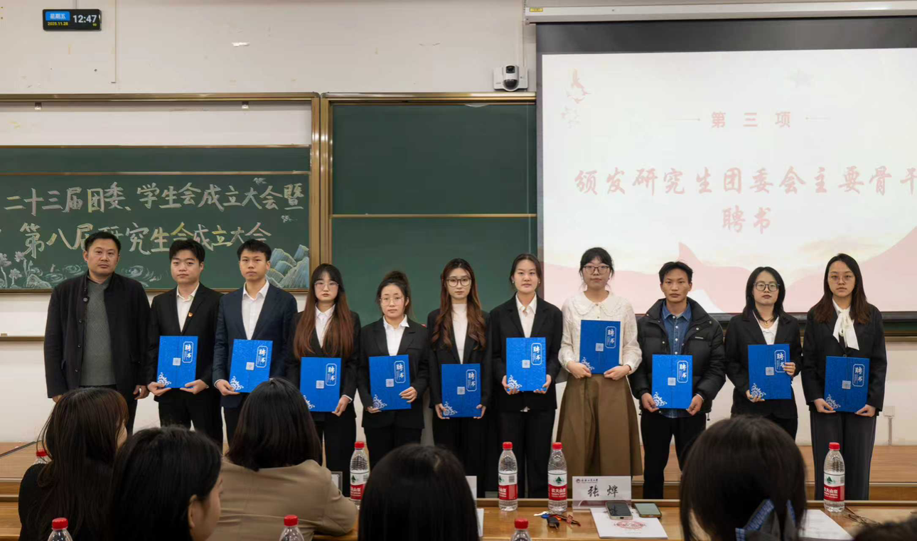 本网讯(通讯员:孙鹏博、谭皓天、夏伟铭)为进一步健全学生组织体系,凝聚青年力量,加强学院学生组织队伍建设。我院于11月28日在西阶202举行第二十三届团委、学生会成立大会暨第八届研究生会成立大会,本次大会由第二十三届学生会主席团成员董宇晗主持,学院党委副书记郑岩、研究生党支部书记张烨、团委书记李秀绒、辅导员孙铭、刘扬以及兄弟学院学团组织代表,全体新一届团学组织成员参加会议。